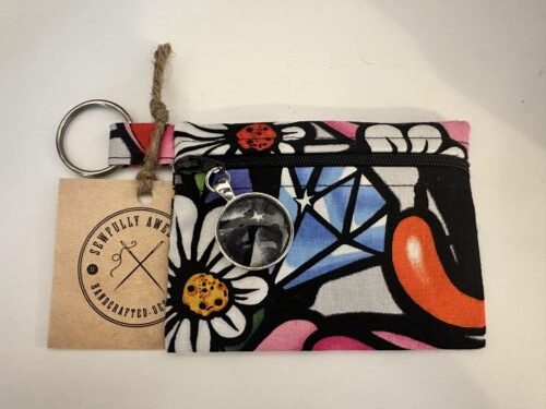Both the inner and outer fabric is cotton, both of which I picked up at local fabric stores.  I also use interfacing between the fabrics to give the coin purse more structure and stiffness and I have serged the inside seams.  The zipper has a pull that is a shiny metal with a glass cabochon.