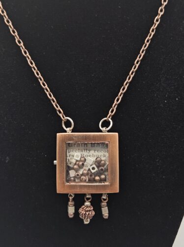 A brushed copper watch casing, refilled with metallic beads and a background image of text. Chain length 19 inches, adjustable shorter by moving the clasp up the chain.